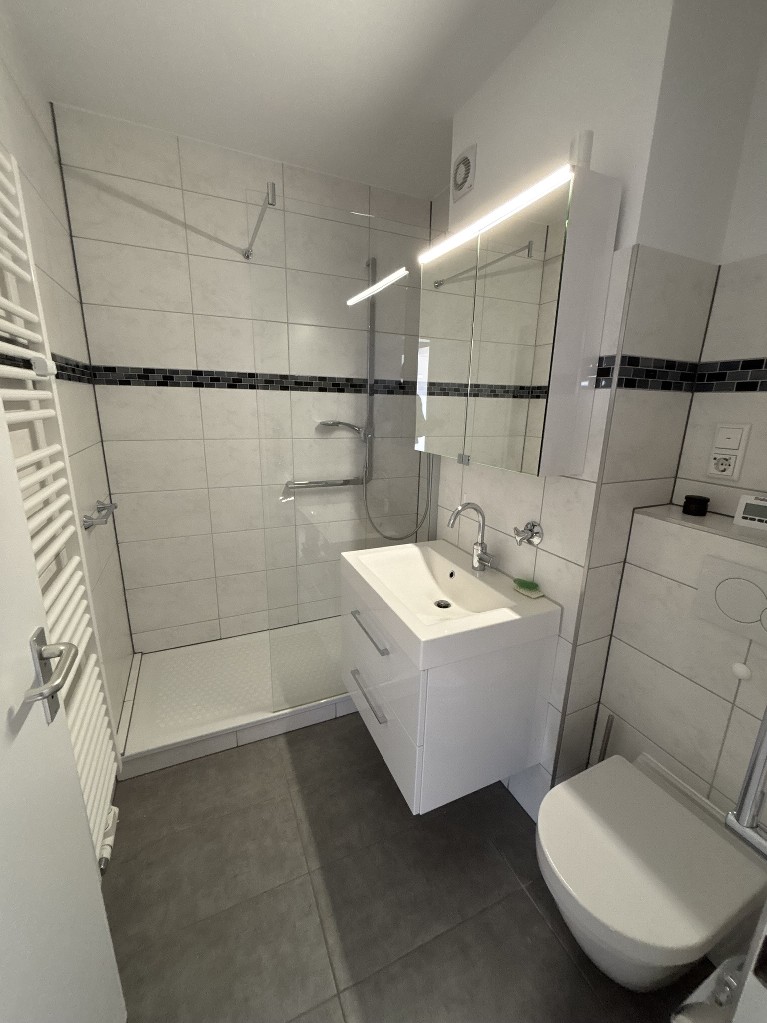 • Das modernisierte Badezimmer ist mit einer großen Dusche, mit niedrigem Einstieg und Glasabtrennung, einem Waschtisch mit Unterschrank sowie einem wandhängenden WC ausgestattet.