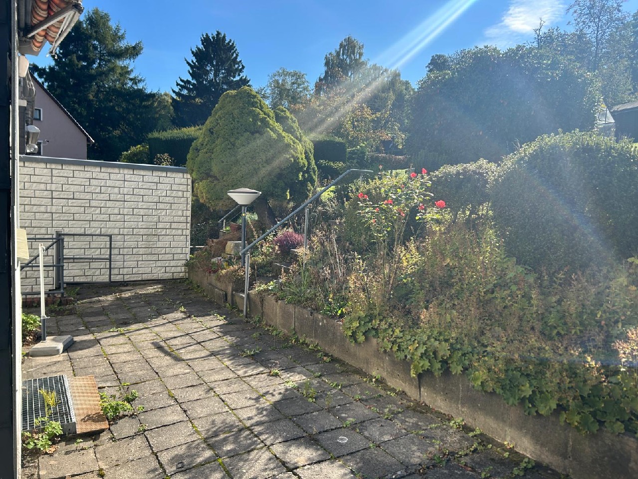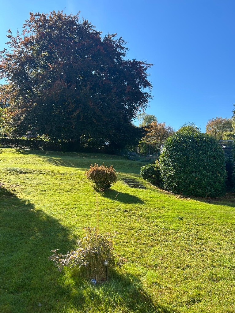 Zum Haus gehören ein kleiner Vorgarten, ein großzügiger Garten mit Rasenflächen, Sträuchern und Baumbestand sowie eine Terrasse.